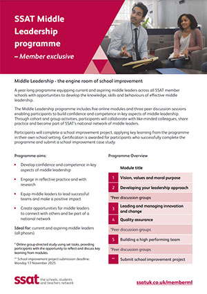 For current and aspiring middle leaders in SSAT member schools. Suitable for primary, secondary and special schools.