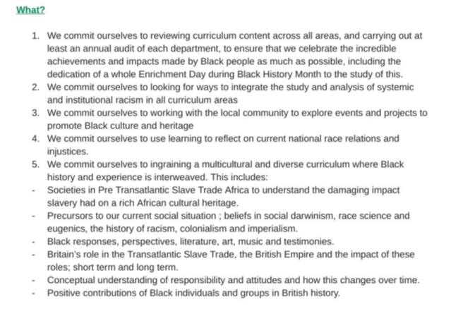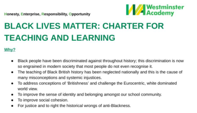 We decided to establish a Black Lives Matter focus group, to lead the development of a whole-school approach to race and equality. This group led a process of consultation and training for staff and supported with the process of curriculum development. We consulted students about their experiences and developed a charter to establish a shared understanding across the academy. You can read Westminster Academy’s Black Lives Matter Teaching and Learning Charter below.