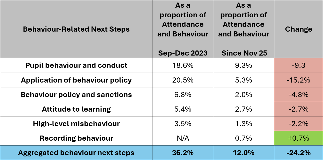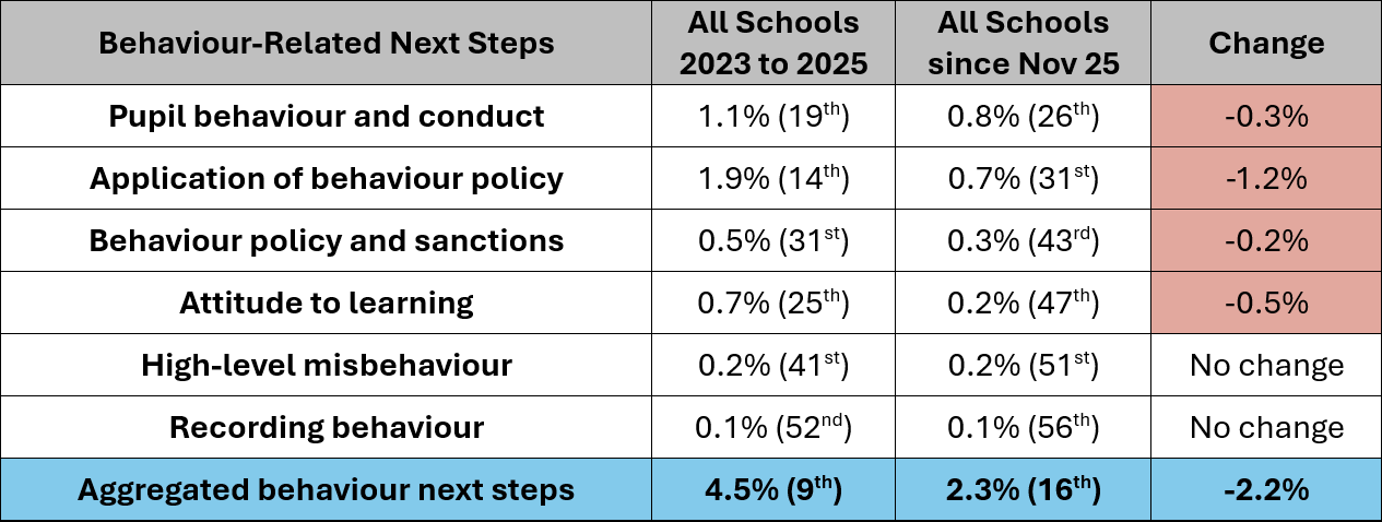 In terms of blowing cold, there is no doubting the decline in focus on behaviour for Ofsted inspection teams. And this has been going on for some time. The data shows that attendance concerns have come to overwhelmingly dominate behaviour concerns in terms of their frequency within the overall ‘Attendance and Behaviour’ judgement area. Consequently, as a proportion of all ‘next steps’ for improvement, behaviour needs have been whittled away from almost one in every twenty needs over the last two academic years, to fewer than one in every forty needs since the November 2025 introduction of the new framework.