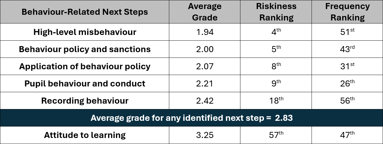 What this table shows is that behaviour next steps, whilst low in frequency, carry a great deal of risk for schools. Four of the six types of behaviour next steps are in the top ten riskiest identified improvement needs. For context, concerns about a school’s safeguarding processes (but not their adherence to statutory duties) are ranked 20th for risk. And general comments around a school needing to improve attendance are ranked 30th for risk with an average grade of 2.74.