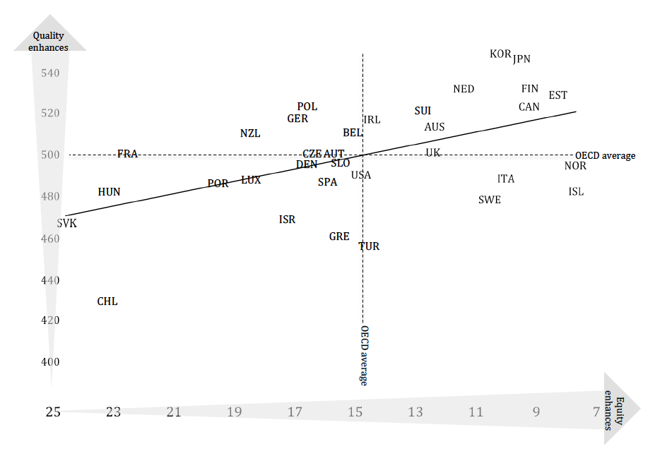 Unlike many other school systems today, the Finnish system has not been infected by market-based education reforms that typically emphasise competition between schools and high-stakes standardised student-testing. The main reason is that the education community in Finland has remained unconvinced that competition and choice with more standardised testing than students evidently require would be good for schools. As a result, Finnish education today offers a compelling model because of its high quality and equitable student learning. As the figure below shows, Finland, Canada, Estonia, Japan, and Korea have education systems that rate highly in quality and equity; they produce consistent learning results regardless of students’ socioeconomic status.