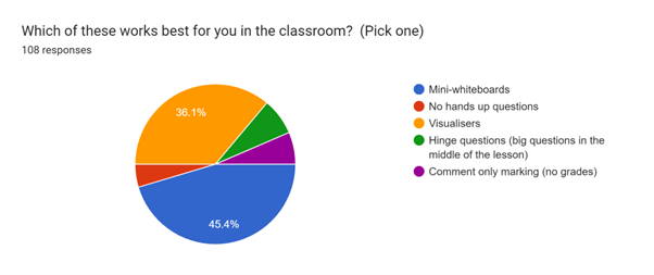 Some of the reasons given by our young people include the low-risk nature of providing answers from the ‘safety’ of their seat, turning whiteboards in unison so that everyone takes part and being able to rub an answer out. Our staff liked the way it does not allow for opt-out and you can quickly grasp students’ understanding without slowing the pace of learning. You can then adapt quickly to this mini-assessment, refining the subsequent teaching in accordance with this newfound knowledge. That is the essence of EFA.