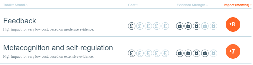 The EEF Toolkit makes useful reading, offering the ‘best bets’ of what has worked most effectively. However, I like many others start with the filter tool for additional months’ progress and look at the top scorers. At the top of the toolkit are: