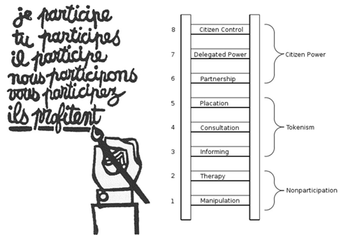 Arnstein’s 1969 paper includes what we would now call an infographic. It seems that many researchers and practitioners of student leadership paid more attention to the image on the right (the ladder metaphor) than to the image on the left. For those of you not familiar with your French verb conjugation, this image suggests that when I, you (singular), s/he, we, and you (plural) participate, everyone (they) profit. This fits well with the social process approach to developing student leadership that we have been developing at SSAT this year.
