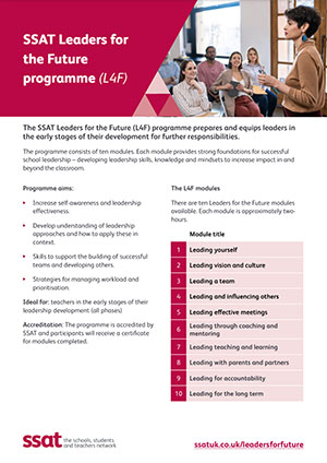 The SSAT Leaders for the Future (L4F) programme prepares and equips leaders in the early stages of their development for further responsibilities.